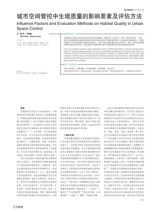 快速城市化过程引发的土地利用变化导致生境破碎,物种灭绝,并引发了一系列“城市生态病”。因此,城市生境质量的影响要素及测度评估研究对促进城市可持续发展和提升人类福祉具有重要意义。文章系统梳理了生态学和地理学领域的相关研究,总结了城市生境质量评估的8种方法,阐述了城市生境质量的影响因素和形成机制,为通过城市空间管控提升城市生境质量进而改善居民福祉提供依据。