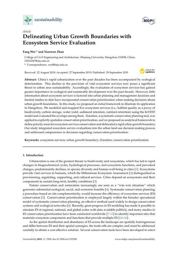 过去几十年,中国快速城镇化伴随着生态恶化,对城市可持续性构成严重威胁。本研究旨在解决在划定城市增长边界时,生态系统服务(ES)评估在城市规划和保护优先排序中整合不足的问题。我们提出了一个以杭州为例的框架,利用InVEST模型对五种ES(栖息地质量、碳储量、产水量、泥沙截留、养分截留)进行建模和制图,并评估了它们之间的重叠。通过系统性保护规划工具Zonation,明确了空间上的保护优先区域。该分析框架定义了ES保护的优先区域并划定了刚性城市增长边界,将ES评估整合到城市土地利用决策过程中,并处理了保护优先排序决策中的权衡。