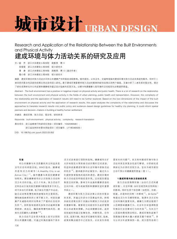 建成环境会对体力活动水平和公共健康产生积极或消极影响。城市规划、公共卫生、交通等领域对建成环境与体力活动关系研究颇丰,但对于二者关系的复杂性及研究成果应用还亟待深入研究。基于建成环境要素对体力活动的影响和研究结果应用两个维度,文章分析了二者关系的复杂性,探讨了研究成果转化为公共政策和健康城市循证设计指南的实现方法。以期为构建健康人居环境的空间规划与决策提供借鉴。