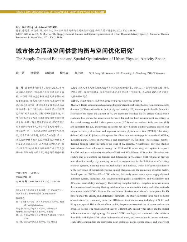 随着城市快节奏、机动化发展,体力活动缺乏引发的慢性病对公共健康构成巨大威胁。科学选择运动类型和运动量是改善慢性病的重要途径,绿色空间和体育空间是城市中重要的体力活动空间,其供需关系直接影响着体力活动水平。基于“慢性病——体力活动——空间供需均衡”的内在逻辑,以杭州市拱墅区为例,本研究量化评估了两类体力活动空间的供需特征及差异,并针对特定群体需求偏好,探究不同空间类型供给与老年人、青少年需求的格局特征。研究表明:第一,体力活动空间的供需分布不均衡,总体呈现“南北高,东西低”的态势;第二,绿色空间和体育空间供需均衡度较高的社区分别聚集在北部和南部,存在明显的空间极化;第三,体力活动空间供需均衡并不代表空间类型供给和群体偏好相互匹配,部分高均衡度的社区也难以满足老年人绿色锻炼或青少年中高强度的活动需求。建议从人与空间精细化匹配、绿色空间运动化、绿体空间耦合、完善空间共享模式等方面进行空间优化,为城市规划的公共健康促进提供新的视角。