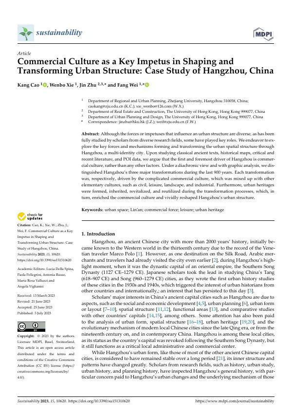 This study investigates the role of commercial culture in shaping and transforming the urban structure of Hangzhou, China, a multi-identity city. Through a diachronic analysis of classical texts, historical maps, and POI data, the research identifies commercial culture as the primary driver, rather than political or economic factors. The study distinguishes three major transformations in Hangzhou’s urban spatial structure over the last 900 years. Each transformation was fueled by a complex interplay of commercial culture with other elements like civil, leisure, landscape, and industrial cultures. Urban heritages were formed, preserved, and revitalized during these transformations, further enriching commercial culture and reshaping the city’s structure. This research offers a continuous, diachronic perspective on urban transformation, highlighting the dynamic interplay of commercial forces and urban development.