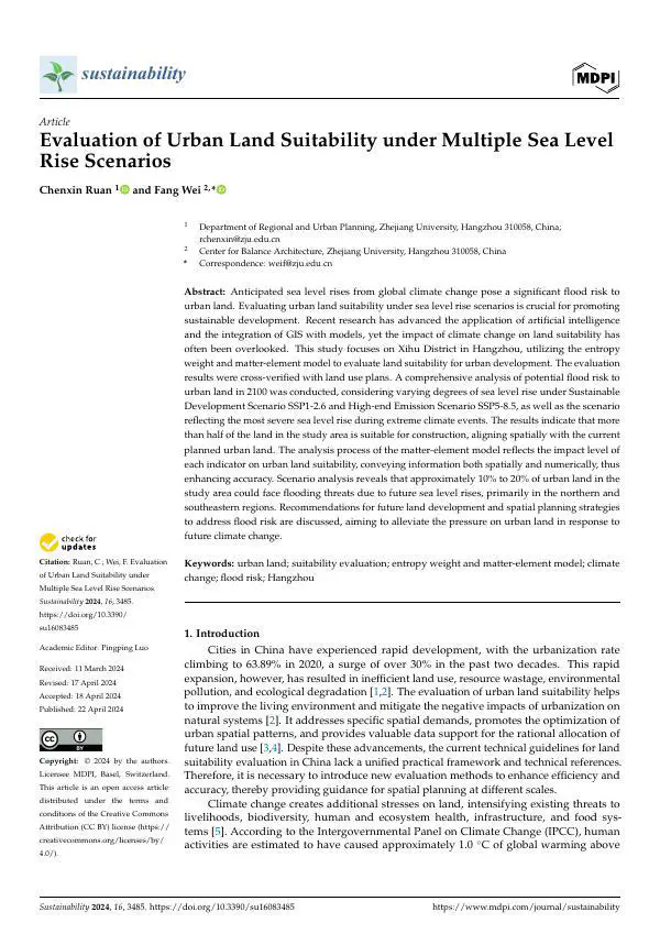 全球气候变化导致的海平面上升对城市土地构成了显著的洪水风险。在海平面上升情景下评估城市土地适宜性对于促进可持续发展至关重要。本研究以杭州西湖区为案例,运用熵权法和事物元模型评估城市开发适宜性。评估结果通过与土地利用规划进行交叉验证。对2100年城市土地的潜在洪水风险进行了综合分析,考虑了可持续发展情景SSP1-2.6和高端排放情景SSP5-8.5下的不同海平面上升程度,以及反映极端气候事件期间最严重海平面上升的情景。结果表明,研究区超过一半的土地适宜建设,其空间分布与当前规划的城市用地基本一致。情景分析显示,约10%至20%的研究区城市土地可能面临未来海平面上升带来的洪水威胁,主要集中在北部和东南部地区。论文讨论了应对未来洪水风险的土地开发和空间规划策略,旨在缓解城市土地面临的未来气候变化压力。